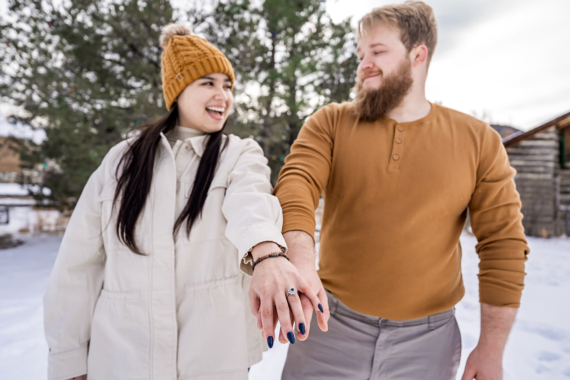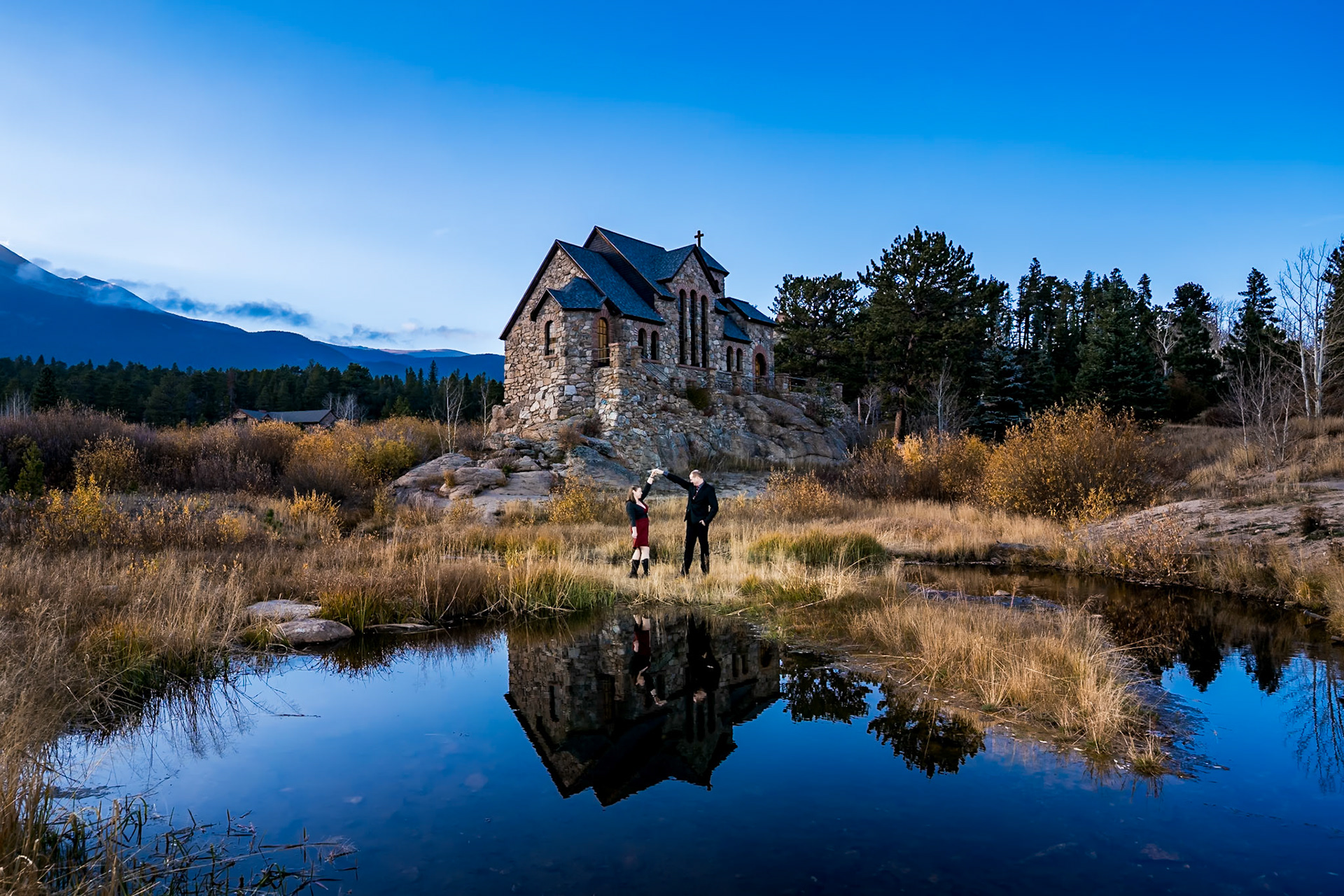 Fun winter engaygement session at Chapel on the Rock and in Rocky Mountain National Park